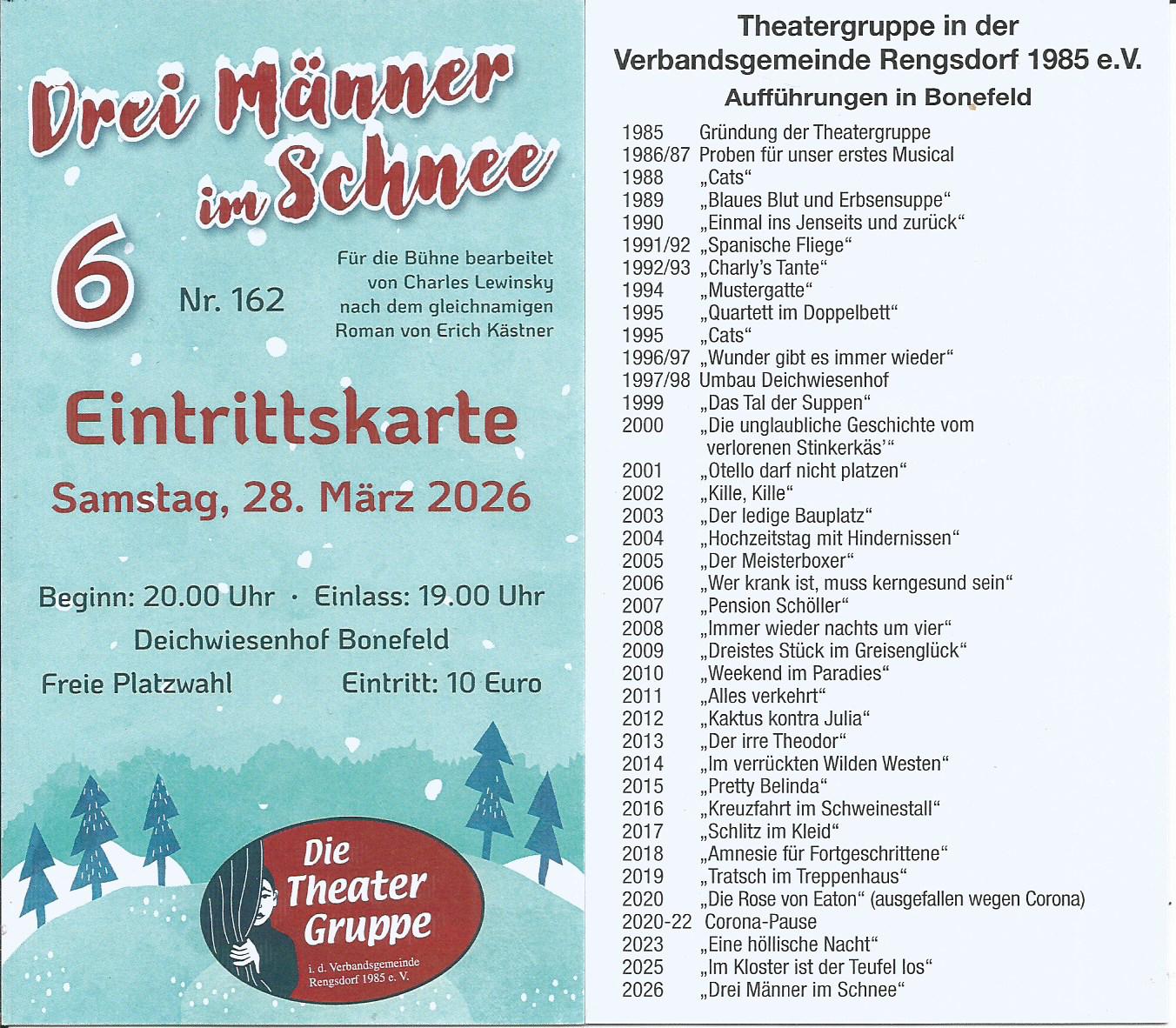 Ein Teil der „Rheinlandsektion“ der Erich Kästner-Gesellschaft hat gestern einen abendlichen Ausflug nach Bonefeld bei Rengsdorf im Westerwald gemacht, um im dortigen Festsaal des Deichwiesenhofs eine Aufführung der Drei Männer im Schnee zu sehen. Uns dreien war klar, dass es sich bei der Theatergruppe wohl um eine Laienspielgruppe handeln würde und wir waren gespannt, wie gut uns deren Gestaltung dieses Kästner-Stoffes gefallen würde, der ja mit seinen schrulligen Charakteren seiner Verwechslungsdynamik und seinem Happy End wie ein dankbarer Stoff daherkommt, aber eben doch einer guten Regieführung und eines fein abgestimmten Timings bedarf, um wirklich gut zu unterhalten.